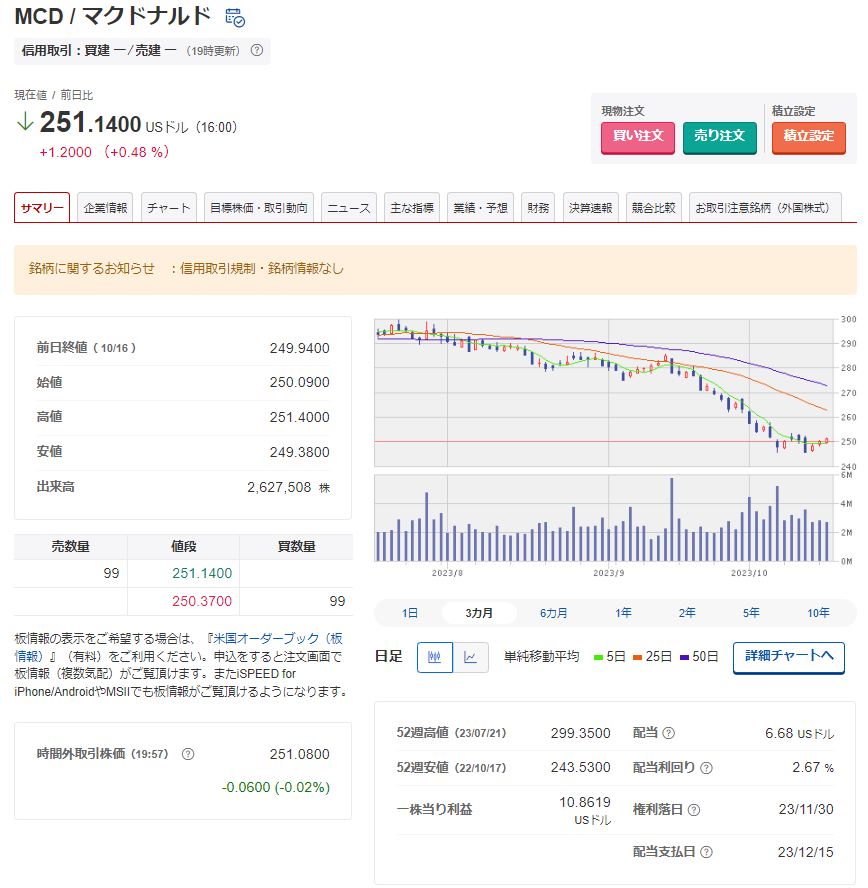 米国マクドナルド(MCD)について、SP信用格付けはBBB+の段階であり、ベライゾンと同じです。どっちもあんまり良い信用評価ではないですね。そして、普通に配当利回りが低いです。正直、手が出るような株価水準でもない。上記画像では配当利回りが2.67%ってことは、米国源泉徴収税で1割抜かれたら、2.4%くらいしかないですゾ…