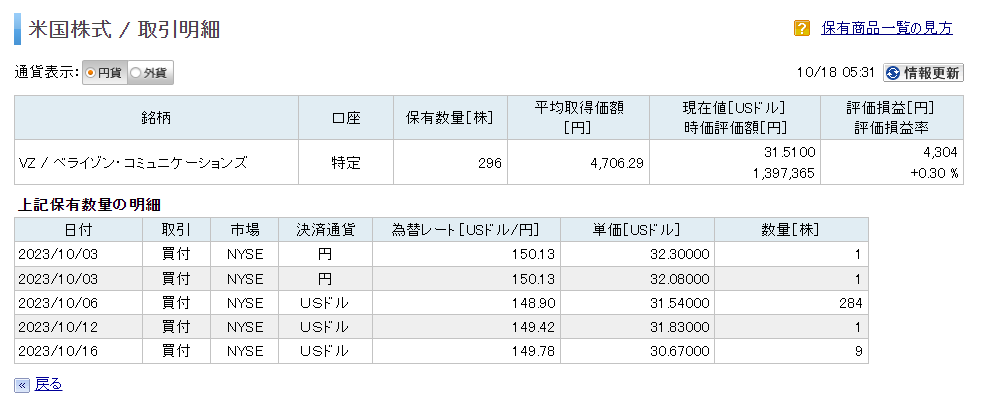 ベライゾンの評価損益が、円貨建てにおいてプラス転換しました。
