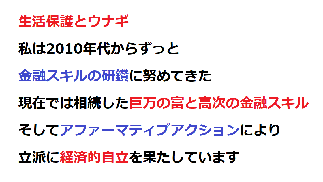 そうすると、生活保護費をもっと多く出して、ウナギを積極的に食べられるように制度を整えるべき。
