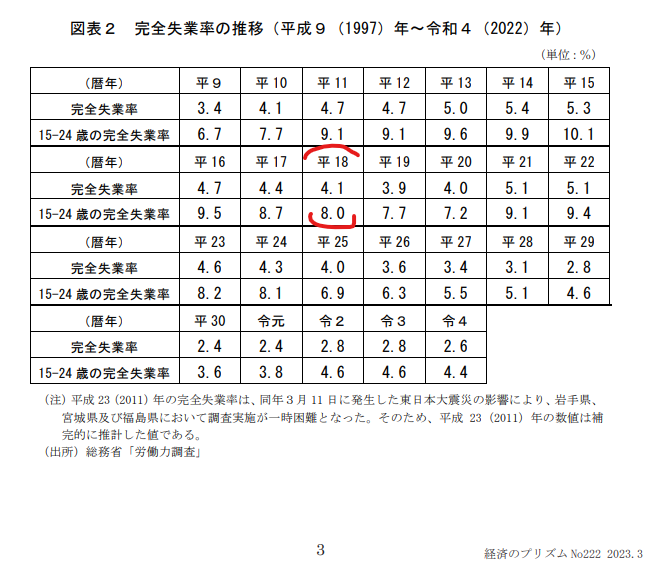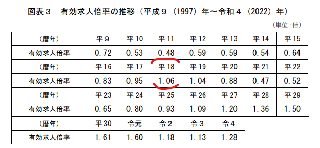 この世代は日本国政府の氷河期の定義には当てはまっているが、実はその氷河期の定義というのは実態を歪めた定義であり、単純に人が余りまくってたマジモンの氷河期世代と、リーマンショックによる不況をくっつけたものでしかないです。上記URLからデータを取り出してみましょう。