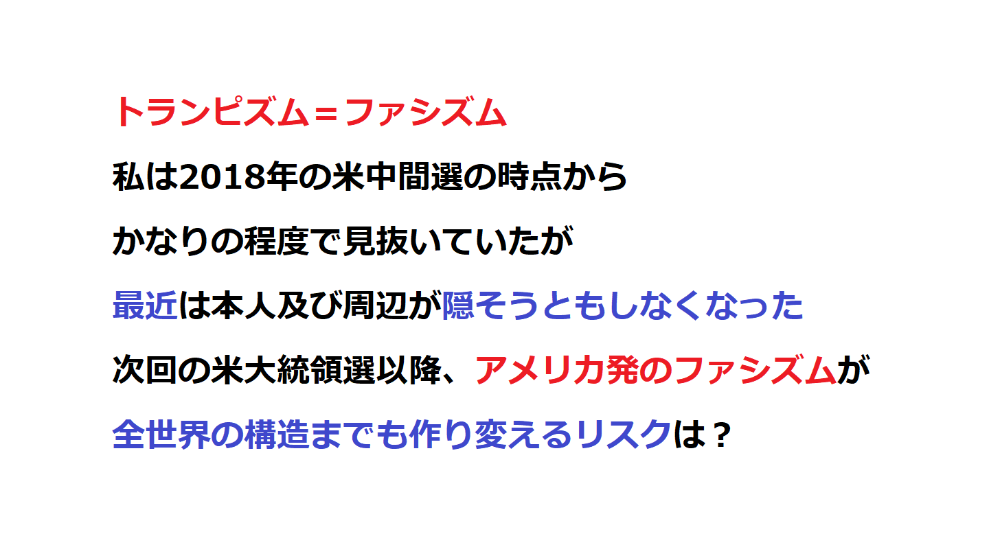 そして、これはアメリカ自国だけの脅威などではなく、日本を含めた他国にとっての脅威でもあります。なぜって、アメリカ発のファシズムが属国である日本、ならびに他の民主主義国にも伝播するって事ですからね。